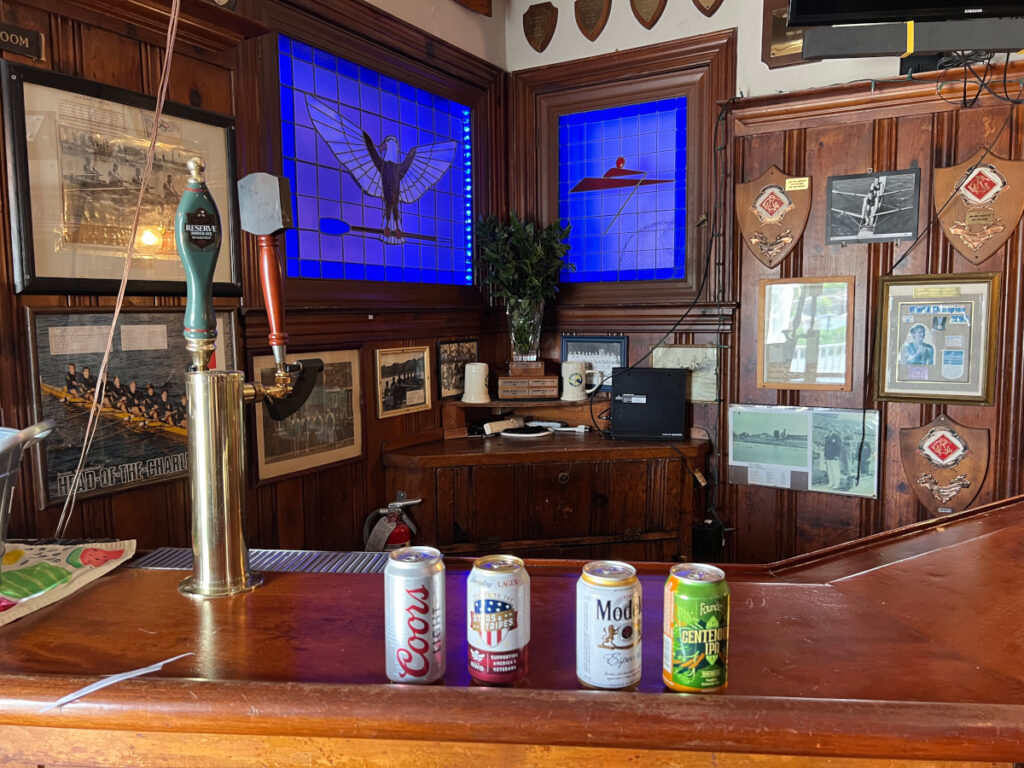Inside the boathouse there is a beautiful wooden bar with seating both at the bar and at high top tables in the bar area. There is a large adjoining room (trophy room) that offers flexible space for a sit-down dinner for a small gathering or it can accommodate larger groups for cocktails or other stand up receptions.
